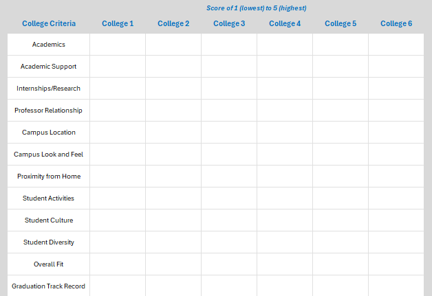 I always recommend creating a pros and cons list for each college. With my students, we take this a step further by using a spreadsheet with college criteria to consider—along with anything individually important the student wants to add.
